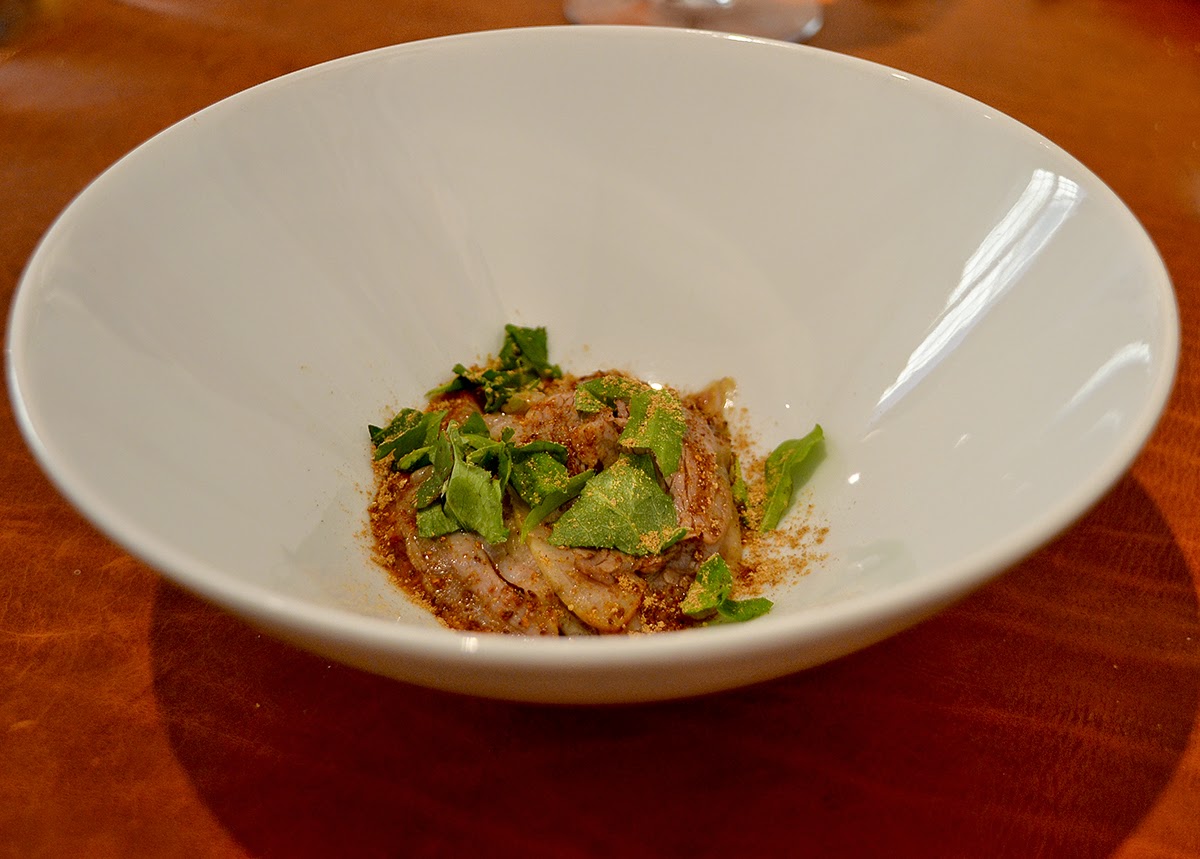Shabu shabu di ricciola, marinata con zucchero e sale, scottata in un brodo di acqua e gin, servita con erbe selvatiche, maionese all'extra vergine, alga wakame fritta e polvere di liquirizia.